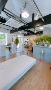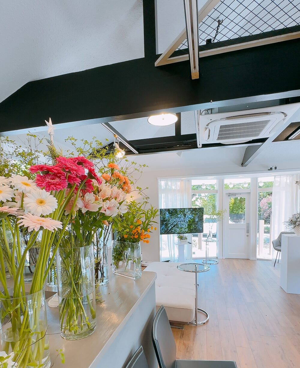 白を基調としたリラックスできる空間を目指しました。家具はシャビーシック調のものを採用 キュアラビューティーサロン青山店[外苑前]